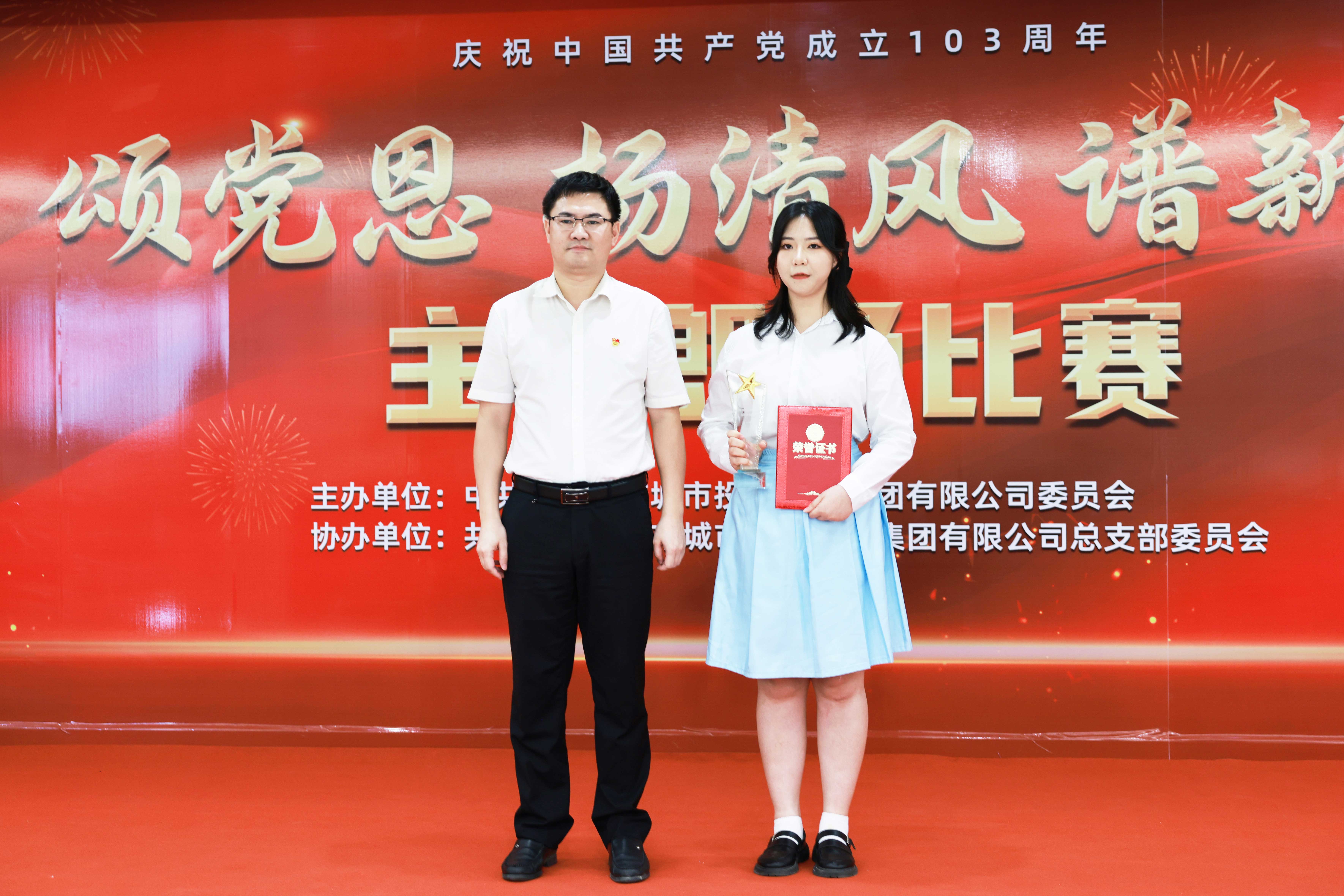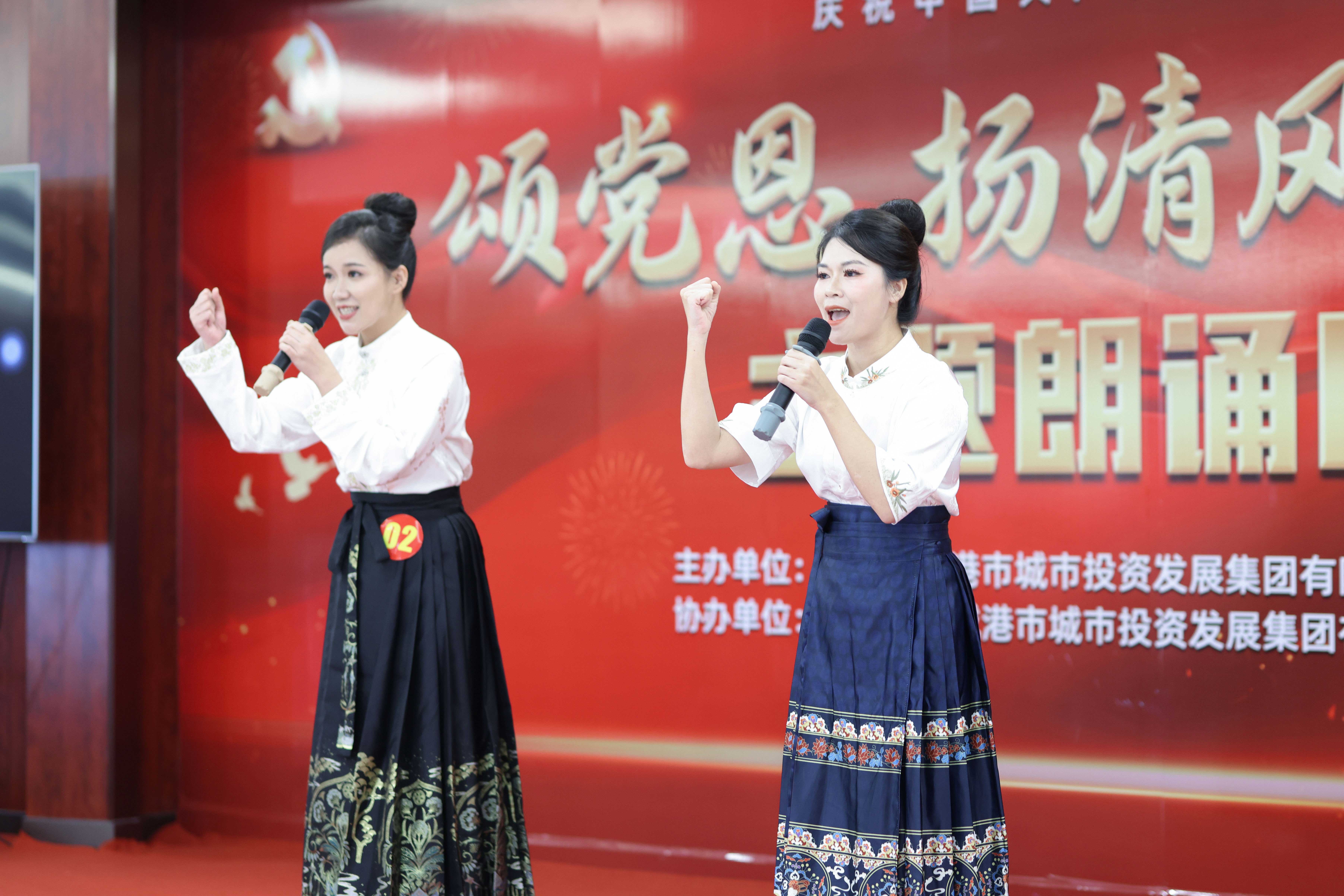 圖為來自市冠辰環(huán)保公司的徐逸翔(左)、陳珊珊(右)朗誦《頌百年黨恩,譜環(huán)保新篇》
