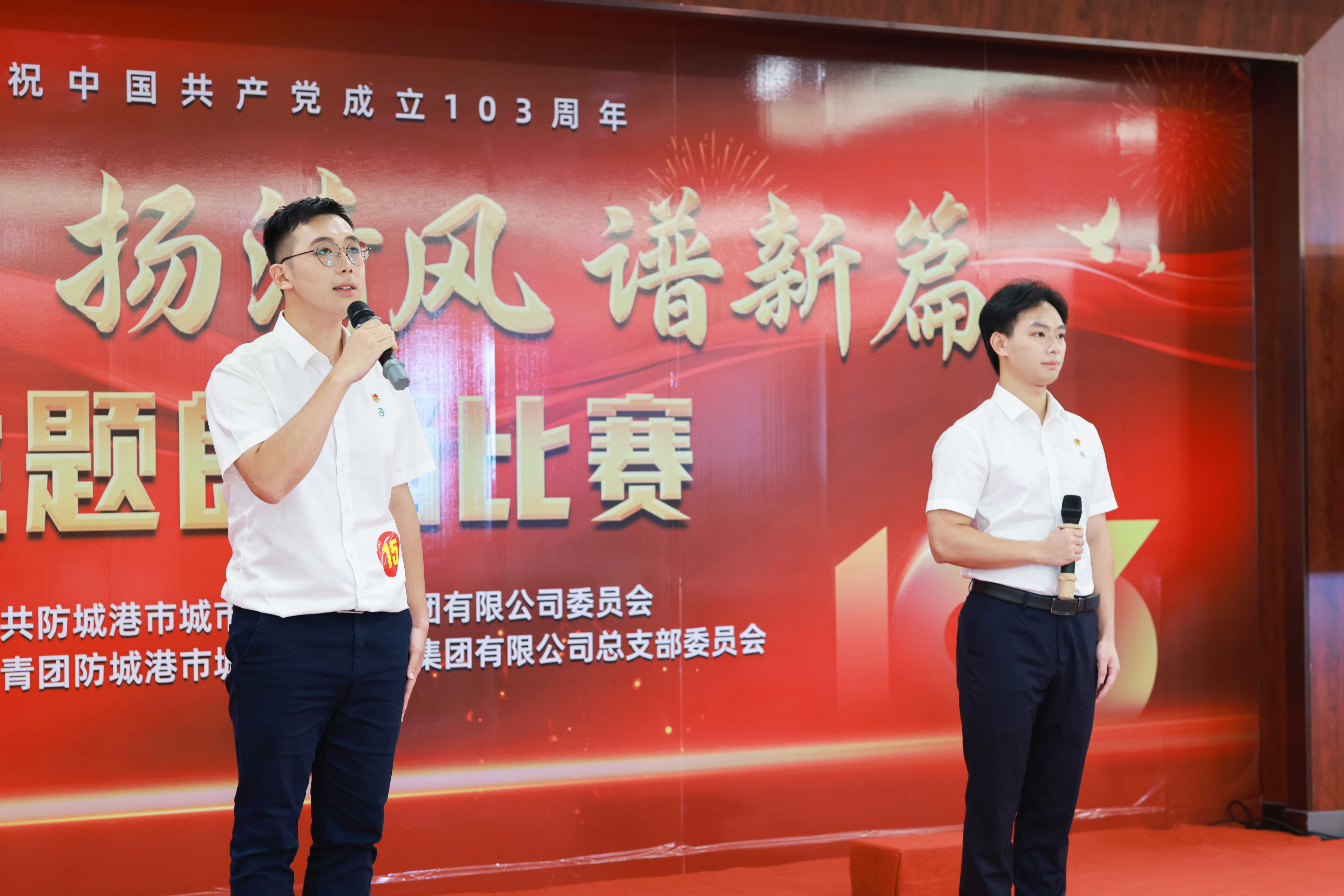圖為來自防城港寶能新材料公司的黃詩淳(左)、顏志偉(右)朗誦《頌黨恩揚清風(fēng),砥礪前行防城港現(xiàn)代化臨港工業(yè)城市建設(shè)新篇章》